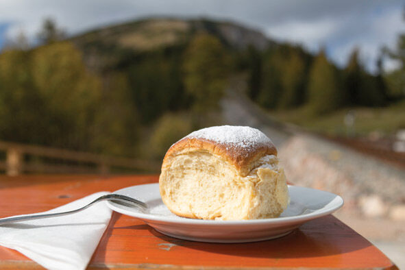 In nur 30 Minuten fährt die Schneeberg-Salamanderbahn von der Talstation hinauf zur 1.322 Meter hoch gelegenen Station Baumgartner. Dort bekommt man während der Saison – zu Betriebszeiten der Schneebergbahn – die berühmten Schneeberg-Buchteln mit verschiedenen Füllungen. Darum ist die Haltestelle auch als Buchtel-Station bekannt. Es gibt natürlich auch die Möglichkeit die Haltestelle auf diesem Weg zu Fuß zu erreichen.