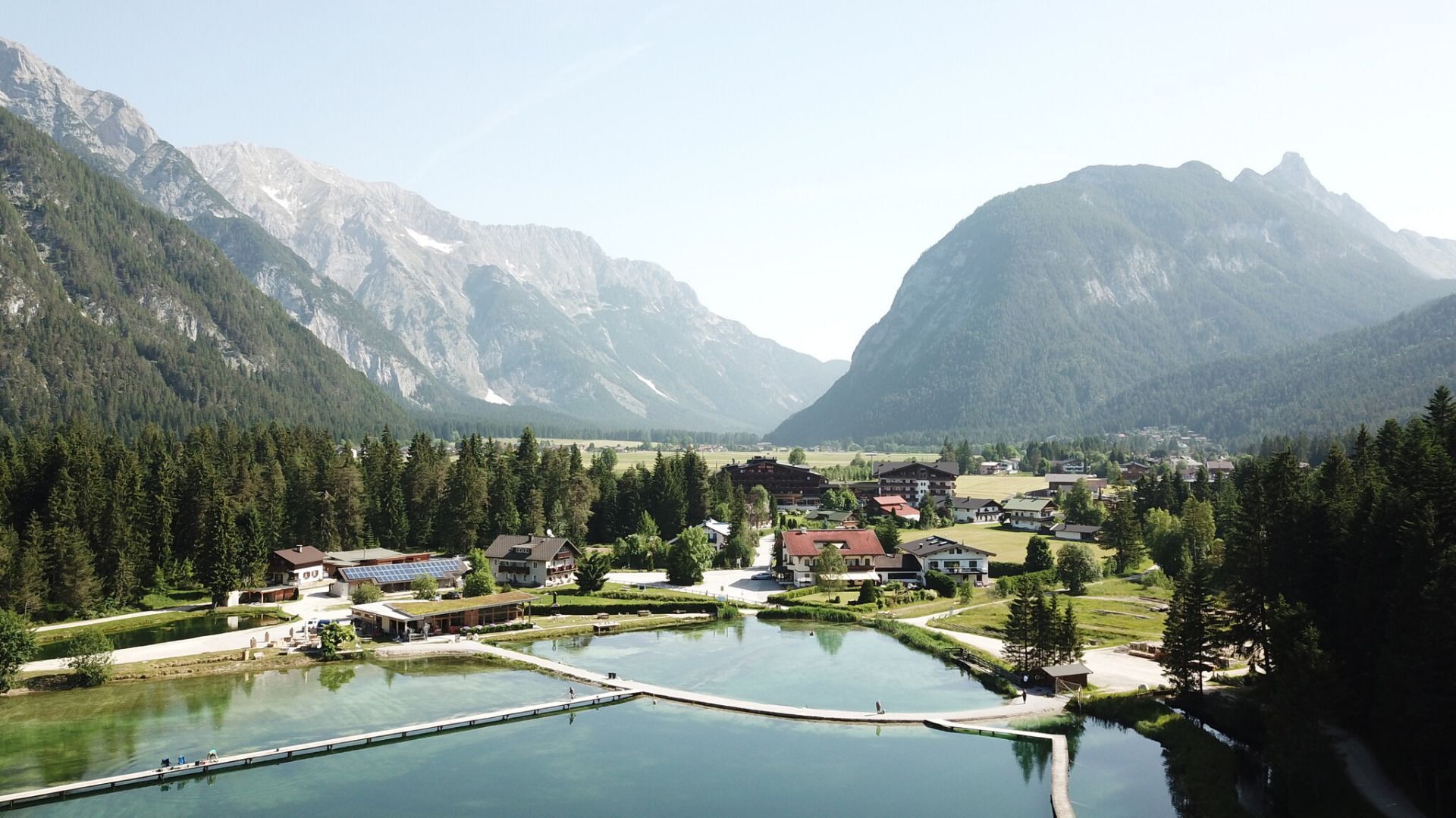 Eure Wanderung startet direkt am Musikpavillon in Leutasch. Direkt davor mit dem Auto am Parkplatz P15 halten oder bei der Bushaltestelle Weidach Zentrum aussteigen. Direkt gegenüber der Haltestelle geht die Straße links vorbei am Hotel zum See und gleich darauf rechts vorbei am Musikpavillon. Dieser Straße folgen bis ihr vor der Wahl zwischen Schotter und Asphaltstraße steht. Beide entlassen euch auf einem Gehsteig, dem er nun nach links folgt, bis ihr am Hotel Quellenhof angekommen seid.